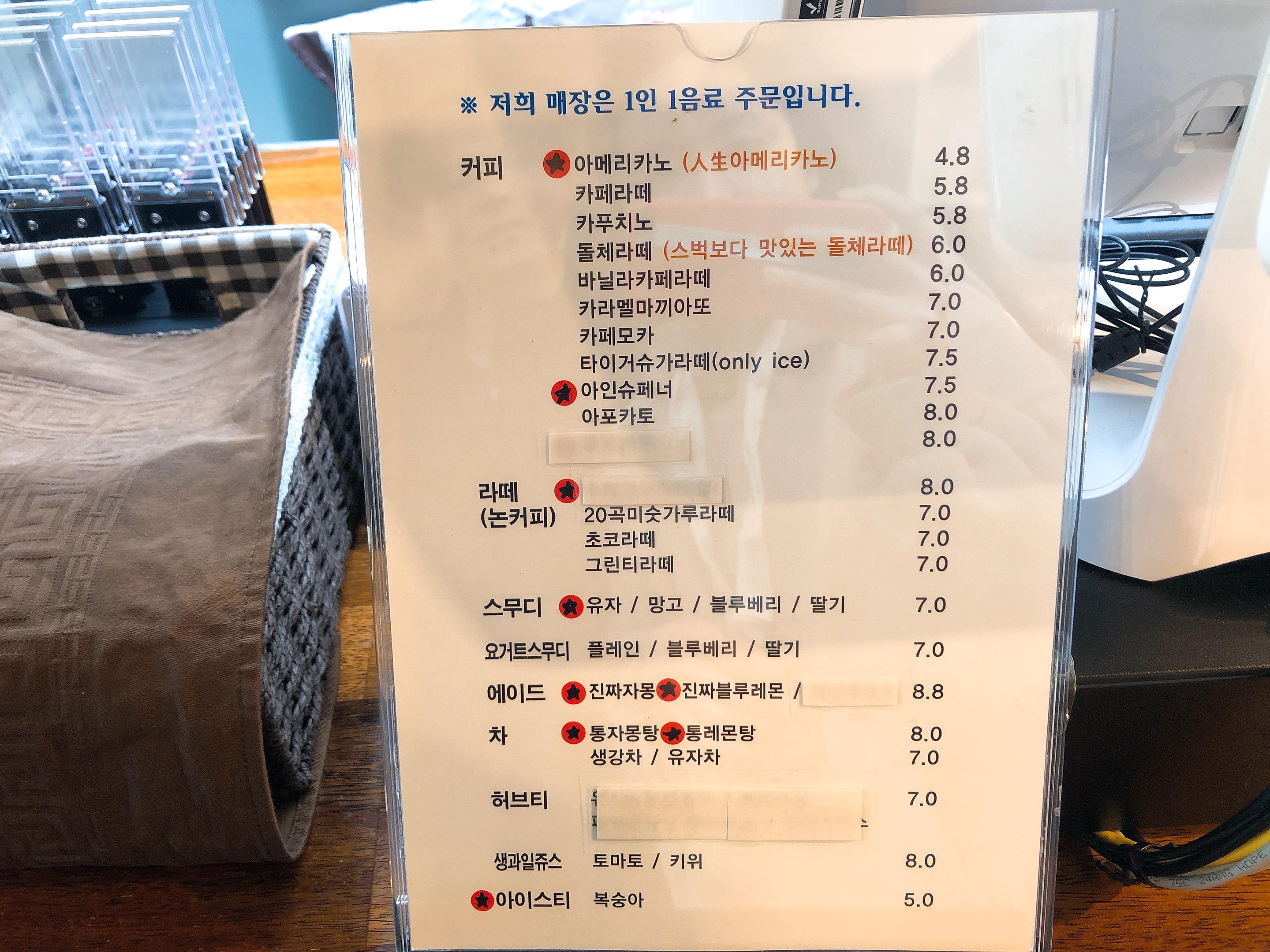 1인 1음료가 원칙이고 아메리카노는 4800원으로 다른 프렌차이즈 카페와 비슷한 가격대였어요~!