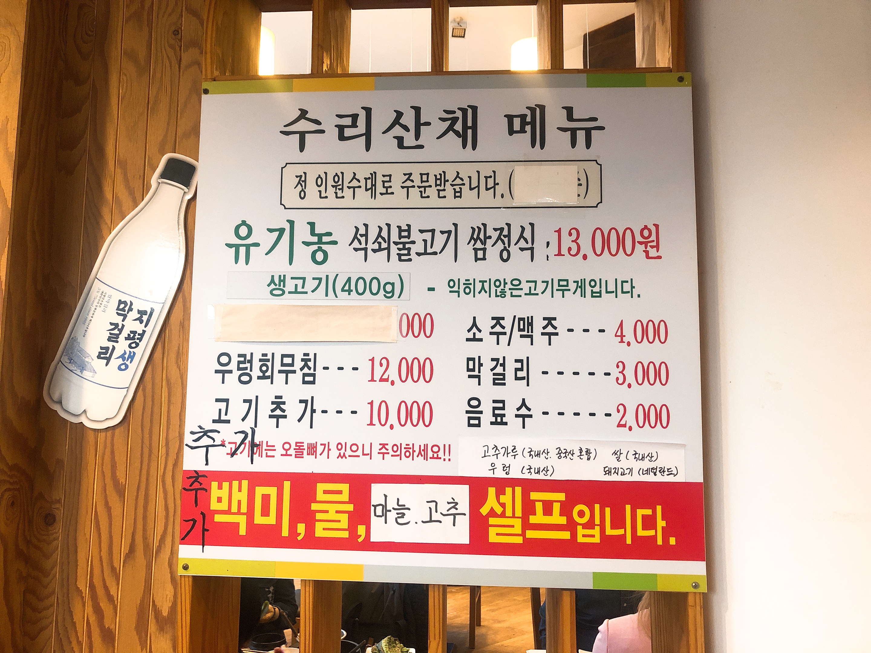 수리산채 내부모습이랑 메뉴판이에요^^ 쌈정식은 1인에 13000원이에요~ 저희는 2개를 시켰어요!