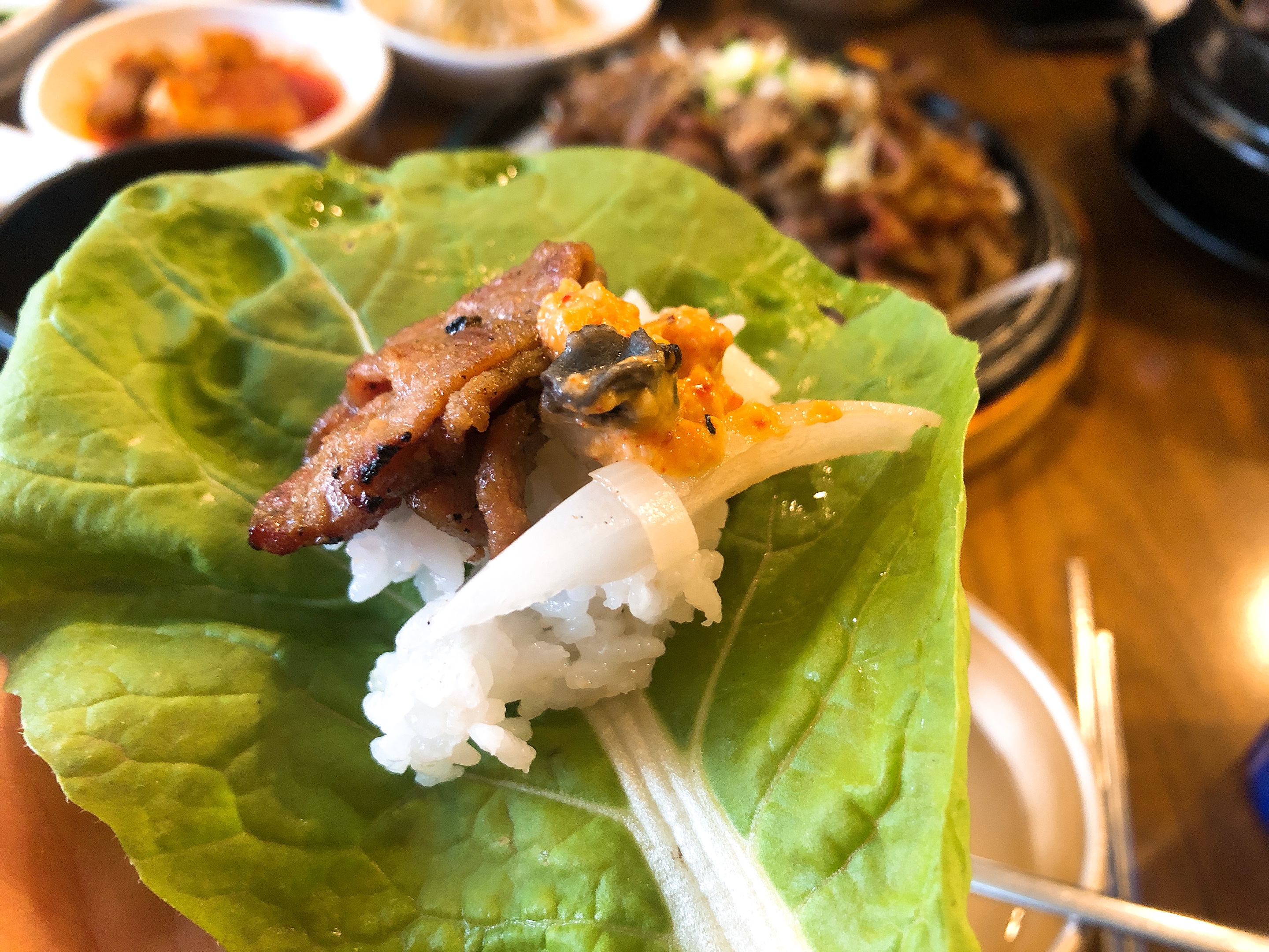 유기농 쌈과 밥이 나와요! 밥이 공기밥이 아닌 백미, 흑미, 그리고 현미인가요..? 저게 뭐죠 ㅠㅠㅎ 특이하게 나오는 것 같아요 ㅋㅋ 백미는 또 먹고 셀프로 가져 올 수 있나봐요~ 양이 작다 생각했는데 고기에 쌈을 싸먹으니 딱 알맞은 양이였어요!