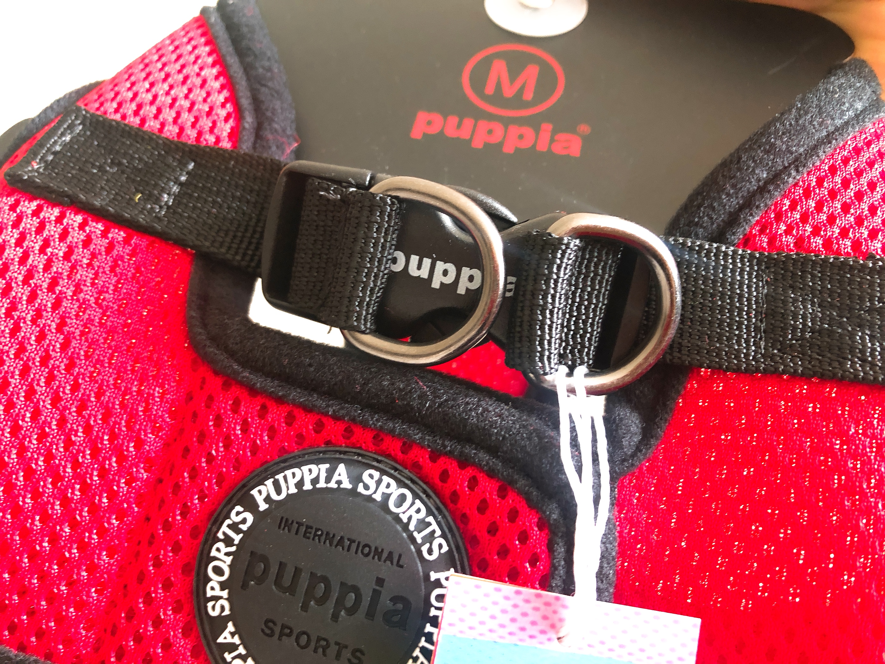 D링에 리드끈을 달았어요~ ㅋㅋ 하네스만 팔아서 리드는 집에 있는걸로 알았어요~ 공식 사이트에 가니까 리드끈과 함께 세트로 팔기도해요!